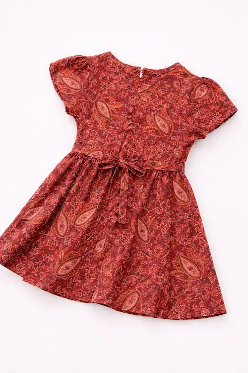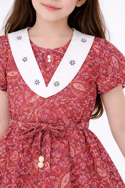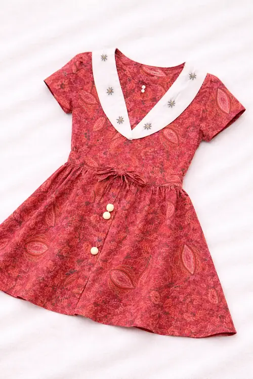 Some prints never go out of style —this is one of them. A grape cotton frock with a wide embroidered sailor collar, flutter short sleeves ,wooden bead detailing ,self-tie belt, and flared skirt with pockets. Bold in print, refined in design